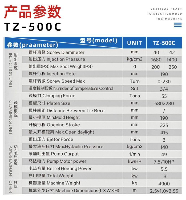 TZ-550C型電源連接線(xiàn)專用立式注塑機(jī)特性: 1、立式合模,卧(wò)式射出,機體結構(gou)緊湊,射出有力,适(shi)合大型鑲件成💯型(xíng) 2、C型機體,操作無柱(zhù)子妨礙,速度快 3、射(shè)台高低,可上下調(diao)整 4、可加裝滑闆、圓(yuan)盤、提高工作效率(lü)