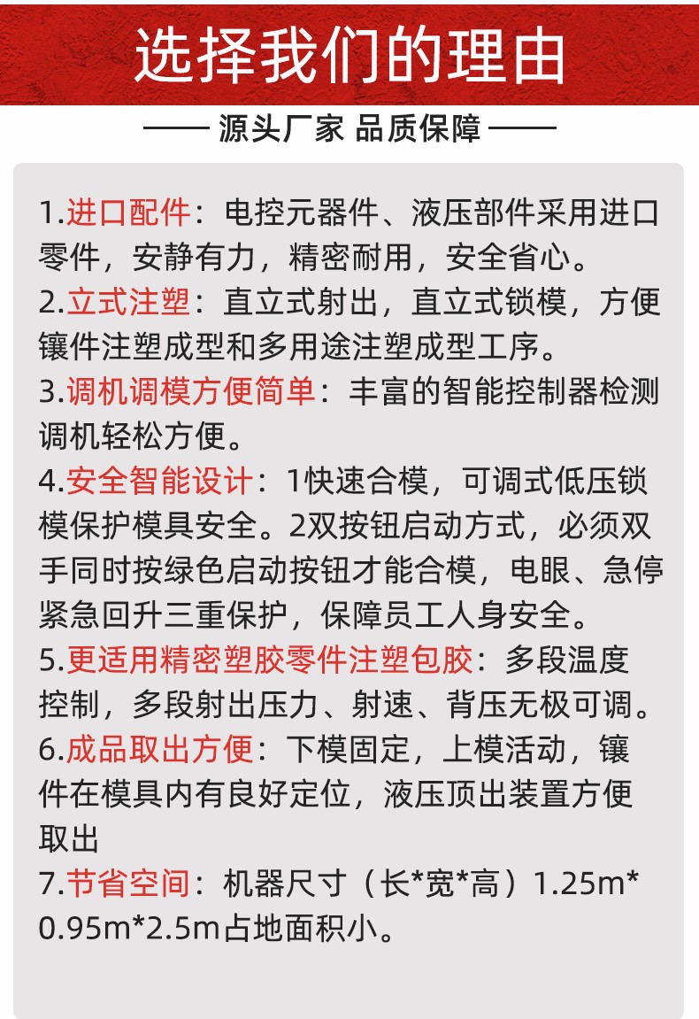 特性: 1.立式合模(mó),卧式射出,機體結(jié)構緊湊,射出有力(li),适合較大型鑲🐆件(jian)✏️成型。 2.C型機體,操作(zuò)無柱子妨礙,速度(dù)快。 3.射台高低,可上(shang)下調整。 4.可選加裝(zhuāng)滑闆、圓盤、提高工(gōng)作效率。